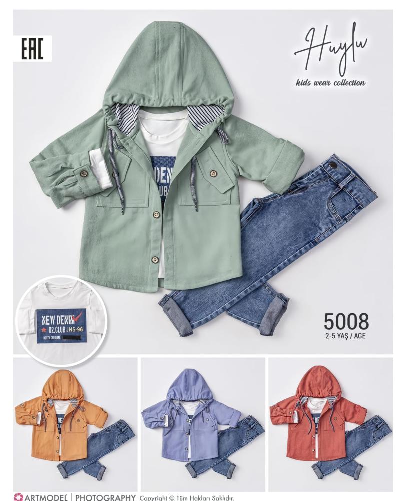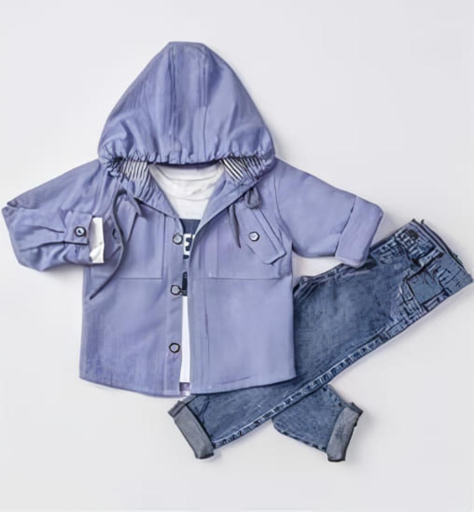 طقم عصري وأنيق للأطفال يتكون من ثلاث قطع: جاكيت بغطاء رأس بلون نحاسي، تي شيرت أبيض، وبنطال جينز رمادي. يوفر الجاكيت دفئًا وأناقة بفضل تصميمه الجذاب والألوان المبهجة، بينما يضمن التي شيرت الأبيض راحة مثالية بملمسه الناعم. البنطال الجينز الأزرق يضيف لمسة من العصرية والمرونة، مما يتيح لطفلك حرية الحركة طوال اليوم. هذا الطقم مصنوع من مواد عالية الجودة، مما يجعله مثاليًا للنزهات والمناسبات اليومية.